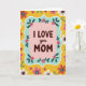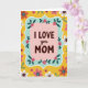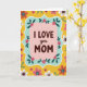 Designed with a sunny mustard yellow background, this card features a central rectangle bordered by a scalloped teal frame that draws your eye inward. Inside the blush pink center, the words “I LOVE you MOM” sit neatly in dark brown, with “I LOVE” and “MOM” in uppercase and “you” in a softer, flowing style for a gentle, affectionate touch ❤️. Around the center panel, stylized flowers and leaves scatter like a cheerful garden, suggesting closeness and care through their clustered placement. Coral blooms, white petals, and several shades of pink mingle with simple green foliage, creating the feeling of a warm embrace without needing extra flourishes. The text is centered and evenly spaced, letting the message feel steady and sincere while the surrounding botanicals add a friendly, celebratory energy 🌼. Cool teal accents balance the warm yellows and pinks, keeping the composition calm while still lively. The front design is finished with flat, graphic shapes and crisp edges, with blossoms and leaves sprinkled across the background around the framed message.