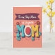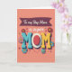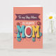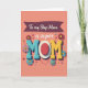 This card features a warm peach background with the big word “MOM” centered in chunky, raised-looking letters that feel like a friendly hug ❤️. The first “M” is textured teal, the last “M” is sunny yellow, and the “O” becomes a red oval framed by a neat white dotted ring, giving it a sweet, affectionate focus. Across the top, a deep plum banner carries the words “To my Step Mom” in light-colored lettering, with “a super” placed nearby in a flowing, cursive-style font. Around the main word, daisy-like flowers in red, pink, and cool blue lean inward as if gathering close, adding a gentle, caring energy 🌼. Small confetti-style dots sprinkle through the space, making the layout feel lively without crowding the message. Beneath the center, a simple curved line with two small dots forms a tiny smile that adds a friendly, companionable touch. Soft shadows sit under the letters and blossoms, and the dotted ring around the red “O” stands out crisply against the peach field.