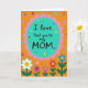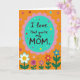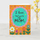 This card features a bright orange background sprinkled with small confetti-like dots in assorted colors, giving the scene an upbeat, friendly energy ❤️. Near the top center sits a teal oval with a soft pink scalloped border, like a framed label drawing your eyes in. Inside the oval, the message “I love that you’re my MOM” is centered in dark brown, using a casual hand-lettered look that feels close and affectionate. The strong contrast between the dark lettering and the aqua-teal center makes the words easy to read at a glance. Along the bottom edge, a simple garden of flowers rises upward, with rounded petals in white, purple, red, and blue that lean toward one another like they’re sharing space. The blooms sit on green stems with small leaves, adding a gentle, caring feel to the layout 🌼. The pink scallops around the teal oval repeat in a neat rhythm, while the colorful dots remain scattered across the orange field behind the flowers.