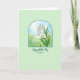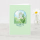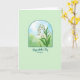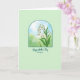 This card features a gentle springtime illustration centered on a small bouquet of bell-shaped blossoms in soft cream, nestled among fresh green leaves. The flowers sit inside an arched window outlined with a thin teal line, like a quiet frame around a private moment shared with someone you love ❤️. Within the arch, the background fades from pale sky blue at the top into a misty wash of light green below, suggesting distant fields and a calm, open day. Outside the arch, the rest of the card stays a uniform pale mint green, giving the scene lots of breathing room and a light, airy feel 🌼. Near the bottom, the words “Happy Mother’s Day” appear in flowing teal lettering, centered beneath the arch. Just below that, “Daughter” is placed in smaller teal text, aligned to match the main line above. The cream petals show faint texture lines, and the teal arch border remains crisp against the mint background.