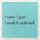 Protect your tabletops or furniture surfaces with a Teal Glitter I Made It Awkward Glass Coaster. Coaster design features the text "I came. I saw. I made it awkward." in a handwritten font against a teal glitter background. Additional gifts available with this design as well as a variety of colors.