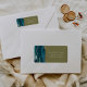The left-hand edge of this elegant modern wedding invitation return address label features a teal blue watercolor agate border trimmed with faux gold glitter. The customizable text combines neutral ivory handwriting and copperplate fonts on a natural, earthy olive green background.