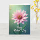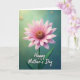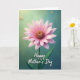 This design shows a large pink flower like an oversized daisy filling the upper part of the card, with many soft petals spreading outward and a warm amber center that draws your eye. The petals fade from deeper rosy pink near the middle to a lighter blush at the tips, giving them a gentle, tender look that feels like a quiet hug ❤️. A slim green stem drops down from the bloom, paired with one curved leaf that leans slightly to the side like it’s reaching toward someone nearby. Behind it all, the background shifts smoothly from a pale yellow-green glow in the upper left to a deeper teal in the lower right, creating a calm, dreamy setting. In the lower half, the message “Happy Mother’s Day” appears in white flowing lettering, centered and floating over the darker area so it stands out clearly. The soft lighting and balanced warm-and-cool colors make the flower feel affectionate and welcoming, like a small gesture of care 🌼. The stem and leaf are a rich green, with the leaf arcing gently beside the straight stem.