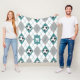 This sporty soccer team colors fleece blanket features a teal blue, gray and white argyle plaid pattern with teal "stitching" extending diagonally across the diamond shapes and black and white soccer balls overlying the teal diamond shapes - customize with athlete's monogram - by katz_d_zynes