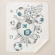 This cool girl's soccer themed Sherpa fleece blanket features an "explosion" of soccer balls with teal, gray and white panels in varying sizes and a gray star shape with white polka dots - customize with player's monogram and jersey number - katz_d_zynes