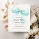 A soft beige, cream colored background, decorated with a large teal, green colored bow. Personalize and add a name and party details.