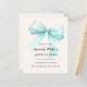 A soft beige, cream colored background, decorated with a large light teal, green colored bow. Personalize and add a name and party details.
