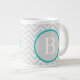 Enjoy your coffee in mass quantities with a Teal Chevron Monogram Jumbo Mug. Mug design features a light gray chevron pattern with a circle emblem outlined in teal. Additional items available with this design as well. Please contact me directly for assistance with personalization.