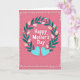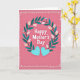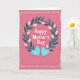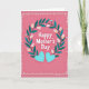 This design shows a bold white celebratory message centered on the card, surrounded by a wreath of deep teal-green leaves that feels like a gentle embrace between close friends ❤️. Small buds weave through the foliage, with pale petals just opening to show soft yellow centers, adding a quiet springtime sweetness. The background is a rosy pink wash that sets a tender, affectionate mood without overpowering the details. The main text sits in the middle, and a smaller line of white text appears beneath it, neatly aligned and easy to read. Below the words, two matching aquamarine hearts rest side by side, their slight shading giving them a softly raised look, like a shared secret between two people. Around the edge, a border of tiny white dots forms a light frame, adding a breezy, decorative touch 🌼. The overall palette balances cool greens and blues against the warm pink backdrop, with the dotted border evenly spaced all the way around the perimeter.