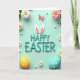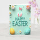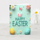 This greeting card features a spring flat-lay scene on a mint green background, with a raised-looking “HAPPY EASTER” message centered in soft teal and gentle shadowing. Just above the words, a pair of white-and-pink bunny ears peeks in, like two friends leaning close for a sweet photo 🐰. Around the edges, white and pale pink daisy-like flowers with sunny yellow centers mingle with fresh green leaves, creating a soft, affectionate frame. A pink butterfly sits near the upper right, angled as if it has just fluttered into the moment. Near the bottom, two large egg shapes—one yellow and one teal—are dotted with small white spots, adding a light, flirty rhythm to the layout 🐇. Smaller white egg-like pieces are scattered between the flowers and lettering, like little treats shared between close companions. The “HAPPY EASTER” text stays in the middle in teal while the pastel flowers and dotted eggs ring the design, with the pink butterfly hovering at the top right.