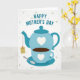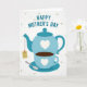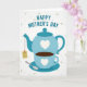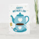 This greeting card features a stylized tea set in calming blues and teals, arranged like a quiet moment shared with care ❤️. A sturdy teapot with a small white heart sits above a matching teacup marked with a tiny heart, suggesting a tender connection in the simplest details. The cup rests on a coordinating saucer and holds a deep brown drink, with a slim spoon placed nearby as if someone just set it down for another person. Near the top, the message “HAPPY MOTHER’S DAY” appears in teal, set in thick, easy-to-read lettering that aligns neatly over the illustration. The background stays soft white with many faint, floating hearts in pale blue and muted beige, adding a gentle, affectionate atmosphere 🌼. A small rectangular tag hangs from the teapot’s spout by a thin string, like a quiet note left with a warm drink. Subtle shading in the teapot, cup, and saucer gives the shapes depth, while the scattered hearts remain light and translucent across the backdrop.