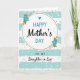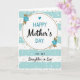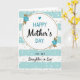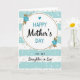 This Mother's Day card features a digital illustration with a large white circle centered on a background of horizontal teal-and-white stripes, setting a calm, affectionate mood ❤️. A thin earthy-brown outline rings the circle, giving it a cozy, natural frame that feels like a gentle embrace. Inside the circle, “HAPPY” sits near the top in teal letters, “Mother’s” is centered in flowing black lettering, and “DAY” appears below in matching teal. A small teal heart floats above the top word, like a quiet nod of love between close family members. Two small floral clusters decorate the frame—one near the upper left and one near the lower right—with teal petals, white centers, and brown leaves that curl in soft tendrils. Below the circle, the line “TO MY Daughter in Law” is placed on the striped background in black flowing lettering, like a tender note added just for her 👩. Scattered white and muted gold dots drift across the stripes like confetti, and the flowers’ white centers stand out against the teal petals.