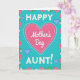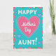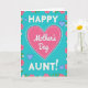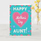 This card features a lively teal background that feels celebratory, with a gentle, affectionate tone suggested by the cozy layout and sweet heart motifs ❤️. In the center sits a large soft-pink heart outlined with a dotted stitch-like border, giving it a snug, crafted look. Inside the heart, the words “Mother’s Day” appear in white flowing lettering, set slightly smaller than the main headline. The word “HAPPY” is placed above the heart in white all-caps, while “AUNT!” sits below in matching white all-caps, balancing the design top and bottom. A continuous floral frame of pink roses, green leaves, and tiny white blossoms wraps around the edges, like a bouquet encircling a loved one 🌼. Small blue hearts are scattered across the teal space, adding little sparks of affection between the flowers and the central heart. The overall look is flat and graphic, with crisp shapes and high contrast between teal, pink, white, green, and soft blue. Along the border, the roses repeat in a neat ring with clusters of leaves and miniature white flowers tucked between petals.