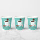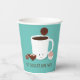 Holiday paper cups for a hot chocolate bomb party. These cups feature a smiling mug of hot cocoa with several hot chocolate bombs on a teal background. The words can be customized. Get these cups for your event.