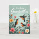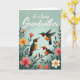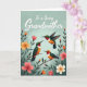 This greeting card features three tiny hummingbird-like birds set against a softly textured teal-green background, creating a calm garden scene with a gentle, affectionate tone ❤️. Two birds rest close together on dark, curving branches, their bodies angled toward each other as if sharing a quiet moment among the flowers. The third bird hovers nearby with wings spread, adding a light sense of movement as it leans toward the blossoms. Coral, peach, and soft yellow blooms and buds cluster along the branches, with small leaves threading between them like a natural frame 🌼. Each bird shows shimmering green on its back, a warm orange chest, and a red throat patch edged by a crisp white band, with long slender beaks pointing toward the petals. Near the top, white lettering reads “To a loving Grandmother,” centered and spaced to float above the birds without covering the branches. Fine details show feathery textures on the wings and tiny veins in the petals, while the darker branches curl diagonally across the lower half of the design. The background stays muted and misty, letting the bright flowers and the birds’ red throat markings stand out clearly.
