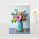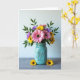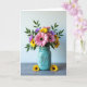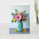 This card shows a still-life bouquet arranged in a matte teal jar, with daisy-like flowers spilling upward in soft pink, sunny yellow, and gentle lavender tones. Several larger pink blooms with darker centers draw the eye, and the way the petals lean toward one another suggests a tender closeness, like friends gathered for a sweet moment ❤️. Green leaves weave between the stems, adding layered texture and a fresh, garden feel. Near the middle of the jar, a small embossed line of text appears as a subtle raised detail, blending into the teal rather than standing out in a contrasting color. The main greeting is placed above the bouquet in a simple, easy-to-read style, set in a warm, light tone that echoes the yellow petals 🌼. Everything sits on a weathered wooden surface, where the grain and worn edges add a cozy, rustic backdrop. Two tiny yellow flowers rest off to the side on the wood, like little accents that mirror the larger blooms.