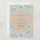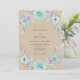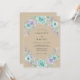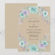 This design features a warm tan background adorned with soft watercolor roses in shades of teal and lavender. Delicate greenery and purple sprigs form graceful floral arrangements at the top and bottom of the layout. The earthy tones create a serene and rustic atmosphere suitable for outdoor or woodland ceremonies. The artistic botanical elements provide a romantic and natural aesthetic.