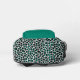 This personalized backpack features a pattern of teal blue and black leopard spots on a white background. Add a monogram and first name in modern black and white script to the teal pocket, with the full name below in white sans serif font. Ideal for back to school!