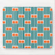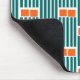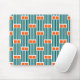 This mouse pad has a mid-century modern design made of five teal lines and two orange rectangles repeated across the design.