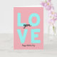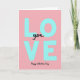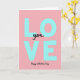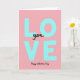 This greeting card centers on the big word “LOVE” in large, chunky sans‑serif letters colored light teal, standing tall down the middle on a soft pastel pink background that feels gentle and romantic 🥰. Tucked into the open space between the “L” and “VE,” the smaller word “you” appears in flowing black cursive, like a quiet note slipped into a confident declaration ❤️. The contrast between the airy pink field and the cool teal letters gives the layout a calm, affectionate balance, as if the design is leaning in for a closeness without crowding. Up close, the teal letters show faint speckles and slightly uneven edges, adding a tactile, human touch that keeps the shapes from feeling too polished. There aren’t characters or scenery, but the typography itself acts like two voices—one big and steady, one soft and intimate—sharing the same space. Near the bottom, “Happy Valentine’s Day” is written in black cursive, centered beneath the main word so the message reads from top to bottom in a smooth flow. The overall layout stays uncluttered, with plenty of pink space around the teal letters and the black cursive lines for “you” and “Happy Valentine’s Day.” The final look is a pastel pink backdrop with teal “LOVE,” black “you” nestled inside, and black “Happy Valentine’s Day” sitting just below.