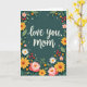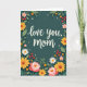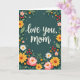 Designed with a deep teal background, this card centers the words “love you, mom” in white lettering that feels gentle and close ❤️. The message sits right in the middle, leaving calm space around it so your eyes land there first. Around the edges, a garden-like border wraps the scene, as if the flowers are leaning in for a soft hug. Yellow blooms, white blossoms, and light pink flowers mix together in multi-petaled and five-petal shapes, suggesting the kind of tender care shared between loved ones. Green leaves weave between the petals, dotted with small red berries that add a cozy, affectionate touch. A few fuzzy-looking orange spheres tuck into the greenery, bringing a light, cheerful contrast 🌼. Tiny pale dots are scattered like little specks of light across the teal field and near the floral frame. Share Mother’s Day sentiments with someone you love, surrounded by a border of flowers, berries, and softly shaded leaves.