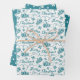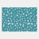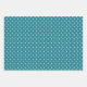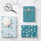 Here's a pretty teal green and white Holiday series of wrapping paper. One paper has a pattern of teal mittens with matching snowflakes on a white background. The script "Merry Christmas" is between the mitten images. One has a white polkadot pattern on a matching teal background.The third paper has a pattern of white ornate snowflakes on the same teal background. All the colors coordinate beautifully together.