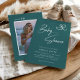 This modern baby shower invitation features elegant hand-lettered script on a soft muted teal background with a sweet heart footprint accent. The back design includes space for a photo or additional details, creating a timeless and personal way to invite loved ones to celebrate your growing family.