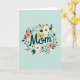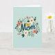 Designed with the word “Mom” centered in dark teal lettering, this card sets a gentle, affectionate tone against a pale blue-green background ❤️. The rounded letter shapes feel soft and welcoming, like a warm hug held in place by a leafy wreath that curves around the text. Flowers in coral, soft cream, and sunny yellow bloom unevenly around the edges, giving the scene a relaxed garden look. Deep green leaves and thin curling vines weave between the blossoms, creating the sense of two close hearts quietly growing together. Small white and yellow accent flowers are sprinkled throughout, adding tiny points of light like shared little moments. The “o” in “Mom” is replaced by a bright yellow winged creature, and its tiny form brings a sweet, caring energy to the center. Two striped flying insects hover nearby as if drawn to the flowers, with one near the upper right and the other closer to the lower left 🌼.