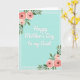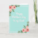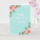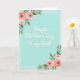 This greeting card features a light teal background sprinkled with tiny white specks, giving it a soft, airy look ❤️. Centered on the front, the message “Happy Mother’s Day to my Aunt” appears in flowing white lettering, standing out clearly against the cool backdrop. The words are arranged in a neat stack, with “Happy Mother’s Day” larger and “to my Aunt” tucked just beneath it. In the upper left corner, a small bouquet of rounded coral and blush-pink flowers leans inward, as if gently reaching toward the message. Mirroring that, the lower right corner holds a matching floral cluster, creating a quiet, friendly balance that feels like a warm embrace. Olive-green leaves and thin stems weave around the blossoms, adding a calm, natural touch 🌼. A dashed line border runs close to the edges, lightly framing the design while the white speckles continue into the corners.