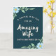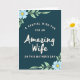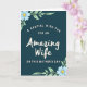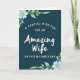 This card features a deep teal background that feels calm and intimate, setting a cozy scene for a loving message ❤️. Near the top, smaller light-cream lines read “A Special Wish For An” and “On This Mother’s Day,” arranged in a gentle curve to guide your eyes inward. In the center, the words “Amazing Wife” appear larger in soft cream lettering with flowing strokes, giving it a tender, romantic emphasis. The mix of smaller curved text and the larger centerpiece creates a sweet, affectionate rhythm, like a quiet note shared between partners. In the upper left corner, a small cluster of light blue daisy-like flowers with sunny yellow centers leans toward the words, adding a soft touch 🌼. In the lower right corner, matching blooms and pale green leaves mirror the arrangement, balancing the layout without crowding the message. Thin green stems and curling tendrils weave around the corners, and the cream text stands out clearly against the rich teal background.