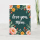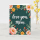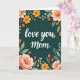 This greeting card features the words “love you, mom.” centered in smooth white lettering that stands out against a deep teal background. The text sits calmly in the middle, like a quiet note shared between close hearts ❤️. Surrounding it is a balanced floral frame that feels like an affectionate embrace, with large blossoms in blush pink and warm yellow arranged on both sides. The petals show gentle shading, and the flower centers have a dotted texture that adds a soft, cozy detail. Slender green stems and leaves curve inward toward the message, guiding the eye the way a caring gesture draws someone closer. Small red berries appear throughout the greenery, some topped with tiny golden fringes, while a few white buds and curling tendrils fill the gaps 🌼. Tiny white dots are scattered across the teal background like faint starlight around the border.
