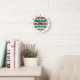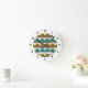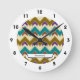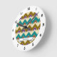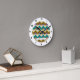 This wall clock features a native tribal pattern of chevrons and arrows in teal, brown, red, blue and beige, with feathered edges. Personalize it with a name.
