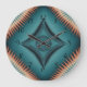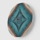 A symmetrical geometric pattern design in a square format with a teal and copper color scheme. The center features a large diamond-shaped medallion with intricate line work and a circular sunburst pattern inside. The medallion is surrounded by four smaller diamond-shaped frames with ornate border patterns. The background has a radiating sunburst effect emanating from the center, creating a dynamic sense of movement. The outer border consists of jagged, sawtooth-like spikes in copper tones against the teal background. The entire design is enclosed by a thin dotted line border. The color palette transitions from deep teal in the center to lighter turquoise tones near the edges, with copper accents in the spikes and decorative elements. The pattern has a Native American or Southwestern design influence with its geometric shapes and radiating motifs.