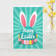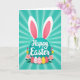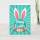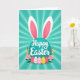 This design shows a large teal circle centered on the front, topped with two long bunny ears outlined in white with soft pink inner panels 🐰. Across the middle of the teal circle, a flowing white message is placed, standing out clearly against the darker color. Behind it, the background features a sunburst of alternating teal rays that spread outward and keep the focus on the center. Below the circle sits a row of five decorated egg shapes, arranged like a shared little display that feels friendly and close, as if set out for someone special. The eggs mix pink, white, and yellow with stripes, zigzags, and dotted patterns, creating small details that look like they were chosen with care. Around the eggs are soft pink flowers with yellow centers and thin green leaves, plus a few upright tulip-like buds in red-pink and yellow 🌷. The bunny ears rise above the teal circle while the patterned eggs and flowers form a neat band along the lower portion of the design.