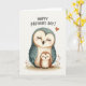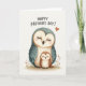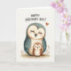 This Mother's Day card features two stylized owls nestled close together, with the larger one in soft teal-blue, creamy white, and warm brown tones gently wrapping its wings around a smaller owlet ❤️. Their eyes are closed and their cheeks carry a light pink blush, creating a tender, cozy moment that feels like a quiet hug. The feathery texture looks like soft watercolor washes, with subtle shading that makes the pair seem plush and calm. A few simple sprigs of foliage in muted green and light brown sit near the bottom, giving the scene a small touch of nature without crowding it. Centered above the owls, the text “HAPPY MOTHER’S DAY!” appears in a friendly, casual handwritten style in dark gray. A small heart icon in a russet tone floats near the upper right, adding a gentle romantic note 🌼. The background stays mostly pale and open, keeping attention on the close embrace and the soft color transitions in their feathers. The larger owl’s teal head fades into cream along the chest while the smaller owlet rests against it, framed by the sparse leaves below and the heart near the top right.