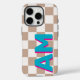 Modern Teal and Hot Pink Shadow Monogrammed Personalized Vertical Big Initial Beige Checkerboard iPhone 16 Pro Case - This trendy brown and beige checkered phone case has large teal and hot pink vertical shadow monogram on the side which you can customize to make this phone case your own.