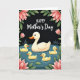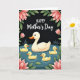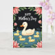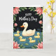 This card shows a cream-colored mother waterfowl gliding across a deep teal pond, her rounded shape softly shaded as she leads the way with a calm, caring presence ❤️. Four small, sun-yellow young swim close beside her, their tight grouping suggesting trust and closeness like a gentle family hug. The water is marked with fine ripple lines that spread outward from their bodies, adding a quiet sense of movement and togetherness. Large blush-pink flowers and rich green leaves curl in from the corners, as if leaning in to frame the scene like friends gathering around. Behind everything, a nearly black background makes the birds and blossoms stand out with a cozy, candlelit contrast. Near the top, the words “HAPPY Mother’s Day” are placed in white, with “HAPPY” smaller above and “Mother’s Day” larger beneath it 🌼. Small touches of warm orange appear on the beaks, and the petals show gentle highlights along their edges against the dark backdrop.