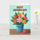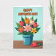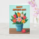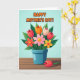 This design shows a bright bouquet of mixed flowers rising from a teal-blue pot, set against a light blue background that feels like a calm spring morning 🌼. Above the bouquet, a celebratory message appears in rounded orange letters, centered near the top and easy to spot. The flowers include closed tulip-like shapes in red, orange, and cream, along with more open blooms in yellow, pink, and coral, each with a contrasting center that draws the eye. Deep green leaves fill out the arrangement, and the close spacing of stems makes the bouquet feel like a friendly hug gathered together ❤️. The pot sits on a rustic wooden surface with horizontal planks in warm brown tones, adding a cozy, grounded setting. Off to the side, a single red bud rests on the wood as if it was gently set down as a small token, with a soft shadow that adds a quiet, affectionate touch. The orange text stays above the flowers while the teal pot anchors the center, keeping the layout balanced. A small red bud lies to the right of the pot on the brown planks, angled slightly upward with a faint shadow beneath it.