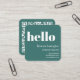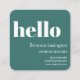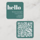 Customizable teal business card, with HELLO typography and name, profession, website and social media details. On the back there is a scannable QR code. To generate a new QR code on the design that links to your own website, click on the "personalize this template" Add your URL address or social media handle in the area provided and a QR code will be generated just for you.