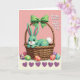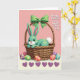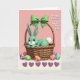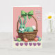 This card shows a teal bunny 🐰 peeking out from a sturdy woven basket, its long ears standing tall and its dark eyes giving a tender, friendly look. A small red nose adds a sweet focal point, as if the little creature is leaning forward to greet someone it cares about. The basket handle is topped with a rich green bow, bringing a fresh contrast against the soft blush-pink background. Below, several decorated eggs in bright colors are scattered, including ones with sunny yellow starburst patterns that add a festive touch. Along the lower edge, a neat row of plum-colored heart shapes lines the base, like a border that quietly hints at affection. A seasonal greeting appears over the illustration in rounded lettering, placed near the center and set in a darker tone that stands out clearly on the pale backdrop 🌷. Behind everything, faint heart shapes are lightly textured across the pink background, and a fluffy white bunny tail peeks out at the basket’s rim.