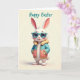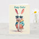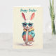 This card features a white rabbit standing upright at the center 🐰, with a soft fur look set against a creamy background that fades outward like a gentle glow. The rabbit’s large blue eyes shine behind oversized teal glasses, and its small smile with a rosy blush suggests a friendly, slightly flirty confidence. It wears a bomber-style jacket in pastel teal and soft coral pink, finished with a sandy-colored collar and ribbed cuffs for a cozy, modern touch. Both front paws rest in the jacket pockets, giving the pose an easy, “come say hi” kind of warmth. Near the top, the words “Happy Easter” appear in teal lettering, positioned above the rabbit so the greeting feels light and airy 🌷. Soft, diffused lighting keeps the colors calm and springlike, with no harsh shadows competing for attention. The teal text sits centered above the rabbit’s head, matching the glasses, while the creamy backdrop stays smooth and uncluttered.