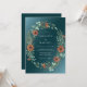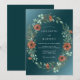 A deep teal backdrop sets a moody and sophisticated tone for this nature-inspired design. Richly colored rust and burnt orange zinnias are nestled among silver dollar eucalyptus leaves and detailed fern fronds. The botanical arrangement creates a lush and organic atmosphere, highlighting a palette of forest green and autumn copper tones.