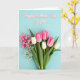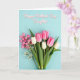 Designed with soft hues and delicate texture, this vertical card centers on a spring bouquet that feels like a gentle gesture between close hearts ❤️. Most of the lower area is filled with pink and white tulips, their curved petals opening among rich green leaves against a calm light-aqua background. Nestled near the larger blooms are smaller deep-pink buds and tiny white filler flowers, adding a sweet, companionable closeness to the arrangement. The stems gather neatly at the bottom and are tied with a teal ribbon that catches the light with a fine shimmer. Near the top, a soft pink message in flowing lettering sits outlined in white, standing out clearly on the lightly speckled backdrop. The lighting stays diffused and tender, bringing out the smooth petals and the fresh greens without harsh shadows 🌼. A faint sparkle across the background and ribbon adds a subtle celebratory touch. The top text floats above the bouquet while the teal bow rests at the very bottom edge of the card.