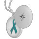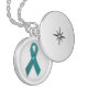 This necklace is made from a teal ribbon made for ovarian cancer survivors. There is a teal diamond in the center. You may choose which necklace you want this image on