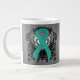 Teal ribbon with angel wings and a filigree pattern. The teal ribbon stands the awareness of Agoraphobia, Anxiety Disorder, Batten Disease, Dissociative Identity Disorder, Ectodermal Dysphasia, Food Allergies, Fragile X, Myasthenia Gravis, Obsessive-Compulsive Disorder, Ovarian Cancer, Tsunami Victims, Tourette's Syndrome awareness, Panic Disorder, Polycystic Kidney Disease, Polycystic Ovarian Syndrome, Scleroderma, Posttraumatic Stress Disorder, Progressive Supranuclear Pals. April is Post Traumatic Stress Disorder Awareness Month, Rape and Assault Awareness Month, and Substance Abuse Awareness Month. May is Food Allergies Awareness Month. June is Scleroderma Awareness Month and Myasthenia Gravis Awareness Month. September is Ovarian Cancer Awareness Month and Polycystic Ovarian Syndrome Awareness Month. October is Anxiety Disorder Awareness Month.