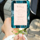 This elegant, modern wedding program fan features a teal blue agate background trimmed with rose gold faux glitter. The text appears in elegant dusty rose handwriting and copperplate fonts on a blush pink rectangle.