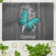 Add a touch of color to your kitchen with a Teal Rustic Butterfly Personalized Kitchen Towel. Towel design features a butterfly against a white leaf vine and dark gray wooden background with a place to personalize with your name. Additional items available with this design as well. Please contact me directly for assistance with personalization.