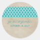 Elegant and sophisticated Rustic Quatrefoil Wedding Stickers featuring a vintage textured look background and a modern pattern border in turquoise. Easy to customize, simply add your wedding details. Click "Customize It" to find more personalization options.