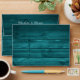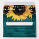 Personalized teal rustic wood and sunflowers wedding envelopes with a return address. Our teal envelopes feature sunflower flowers and string lights on a barn wood background. Matching items available.