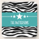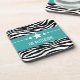 Trendy and modern Sassy Star Zebra Coaster Set featuring a chic black and white zebra print background and a bold turquoise border adorned with a fun star motif. This girly design may be customized with the personalized text of your choosing. Click "Customize It" to find more personalization options.